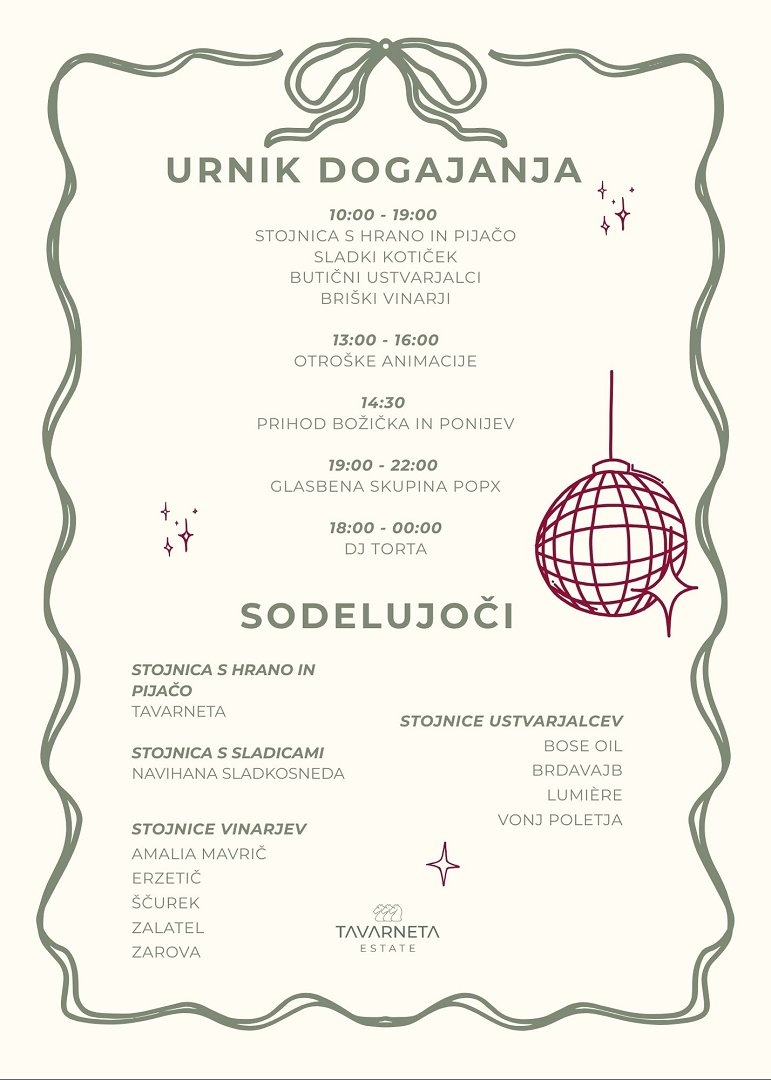 Vabljeni na čaroben decembrski dan, ko se Tavarneta Estate preoblikuje v praznično zatočišče toplih luči, dišečih dobrot in dobrega vzdušja.