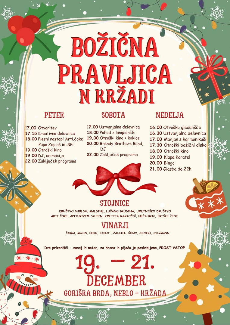 Prisrčno vabljeni v Brda, v Neblo na Kržado, kjer bomo med 19. in 21. decembrom skupaj ustvarjali čarobno božično pravljico. V praznično okrašenem ambientu vas vsak dan med 17.00 in 22.00 čaka toplo vzdušje, polno glasbe, otroškega smeha, druženja in dobrih briških okusov.