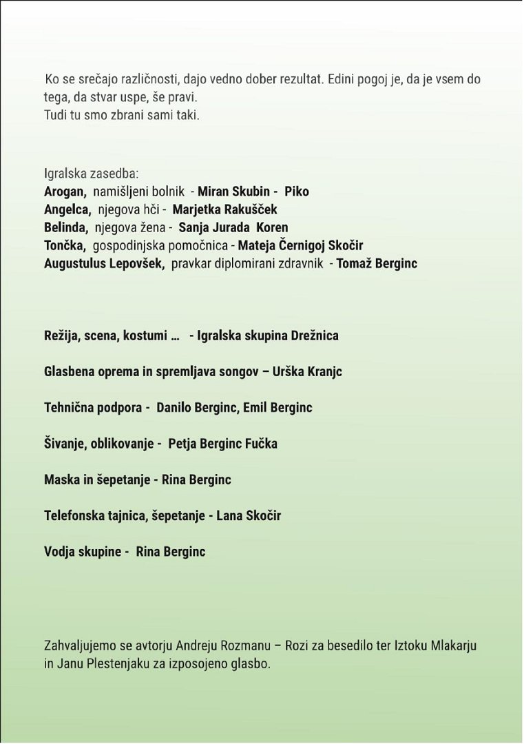 Vabljeni na gledališko predstavo HIPOHONDRIJA ali NA SMRT ZDRAV. Predstavo bo izvedla KUD Igralska skupina Drežnica, avtor pa je Andrej Rozman Roza.